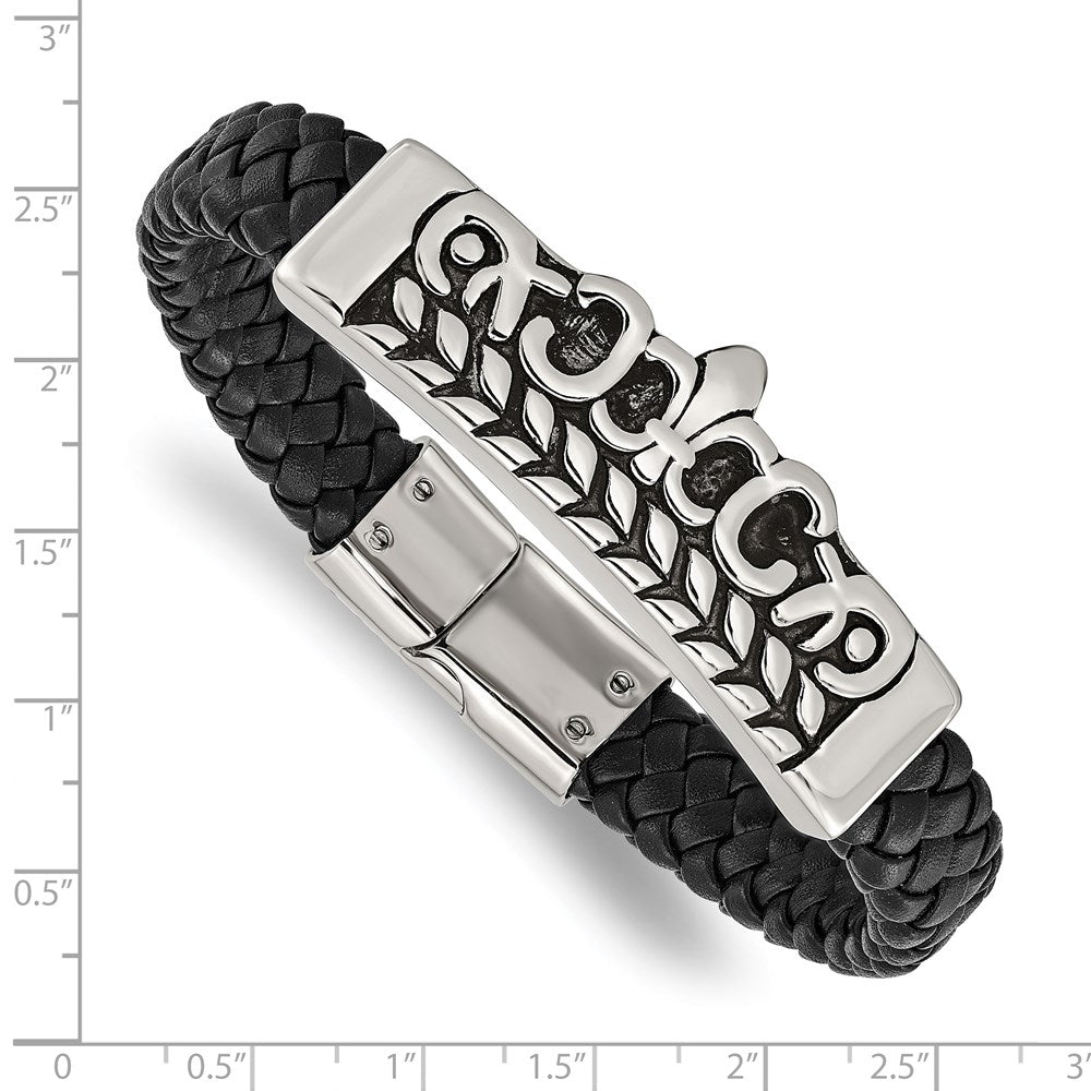 Stainless Steel Antiqued And Polished Fleur De Lis Black Leather Bracelet