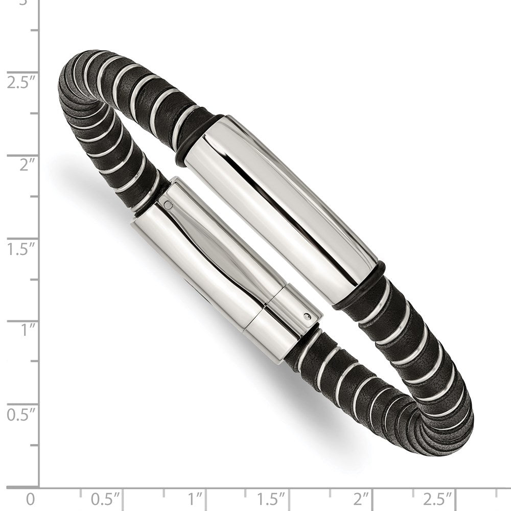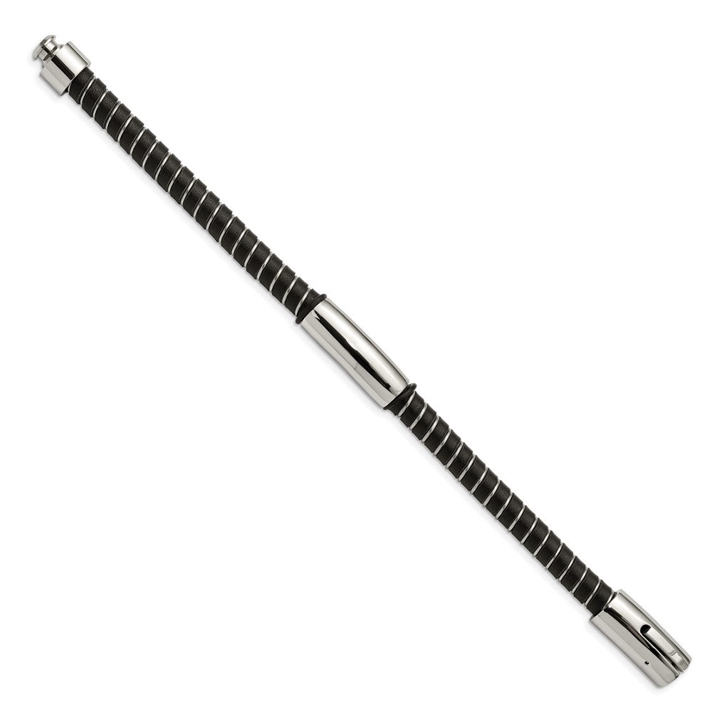Stainless Steel Polished Black Leather 8.75In Bracelet