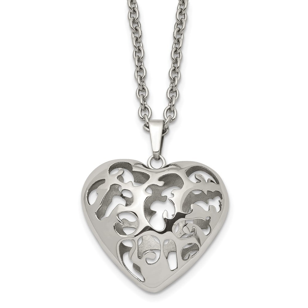 Stainless Steel Polished Filigree Puffed Heart 20In Necklace