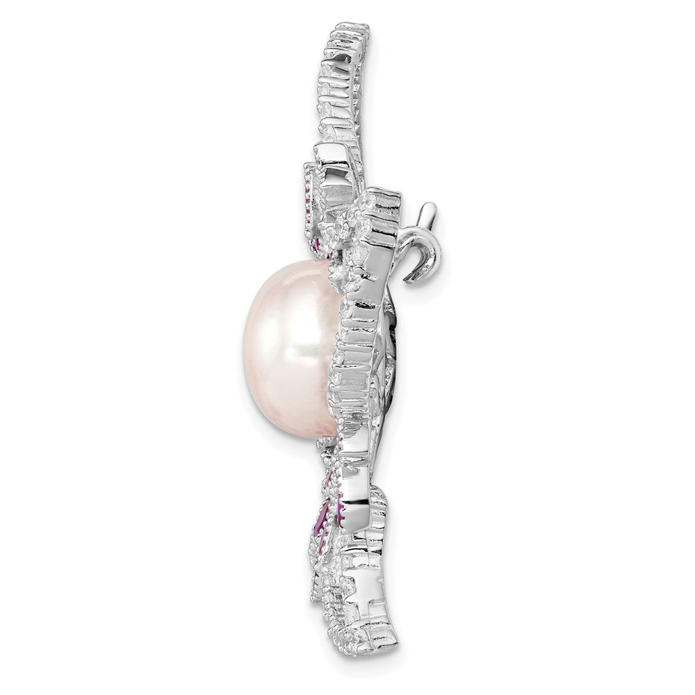 Sterling Silver Rhodium-Plated Filigree Flower With Clear Cz And Pink Corundum Stone Accents And 10-11Mm White Freshwater Cultured Pearl Pin Brooch