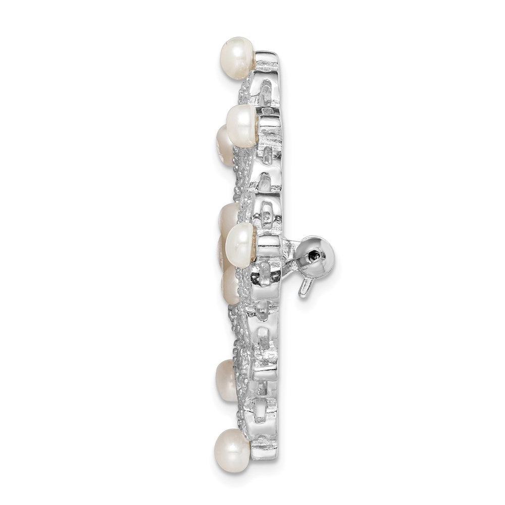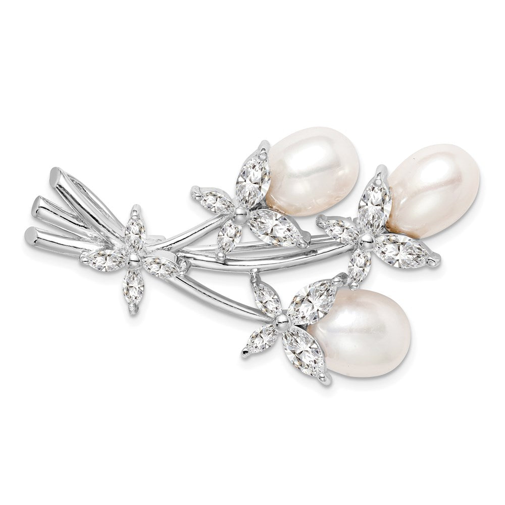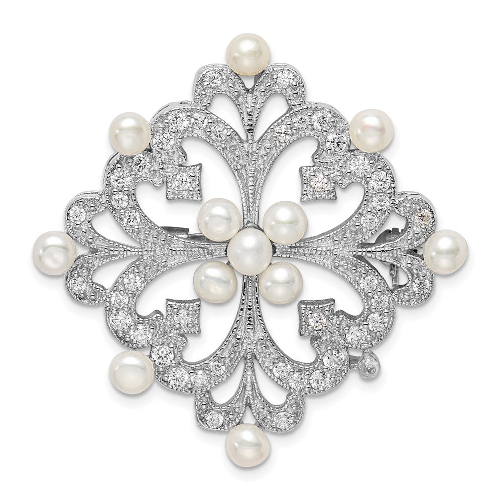 Sterling Silver Rhodium-Plated Clear Cz And White Freshwater Cultured Pearl Pin Brooch