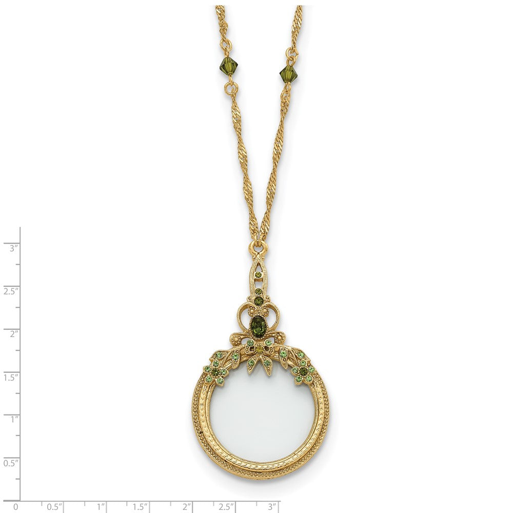 1928 Jewelry Burnished Brass-Tone Light And Dark Green Crystal 2X Magnifying Glass 30 Inch Vintage Necklace